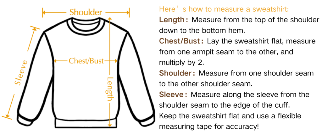 Size Chart How to use our Size Guide1. Lay down a T-shirt or hoodie you currently wear or know fits you on a flat surface.2. Measure the width (chest) and length and compare it to our charts below. Remember, we are measuring the shirt, not your body. 【Classic T-shirts】: 【Hoodie】: 1inch=2.54cmSizes can vary from 1-2 inches because they are measured by hand.